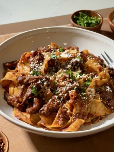 This Spicy Short Rib Ragu Pasta is slow-simmered to perfection with tender beef short ribs, chipotle, jalapeño, and smoky spices. Rich, spicy, and deeply flavorful, it’s tossed with pasta and finished with cotija and cilantro for a comforting and super satisfying fusion dish.
